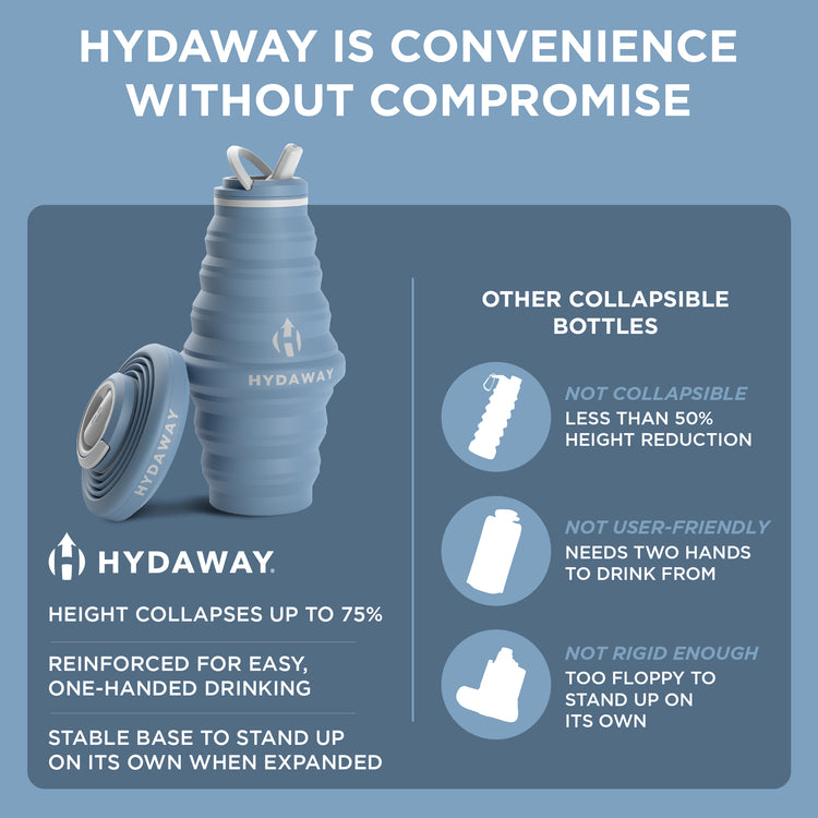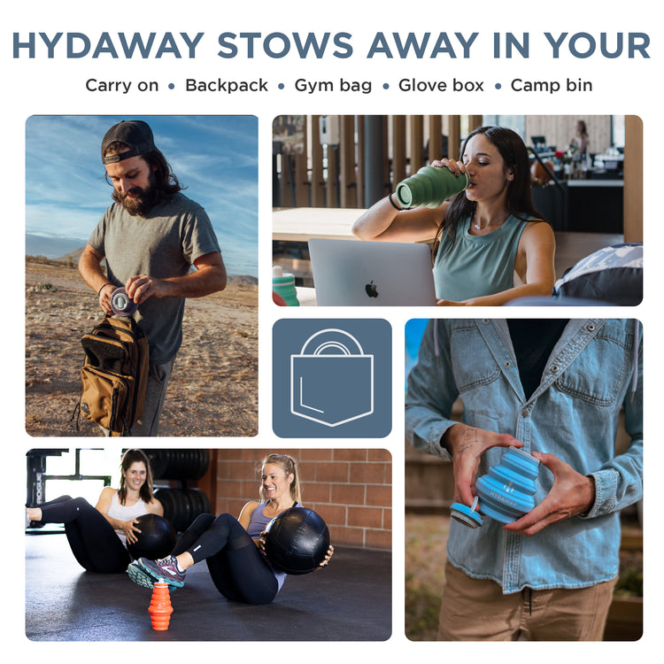 Meet HYDAWAY. The collapsible, ultra-stashable, planet-friendly, go-anywhere way to stay hydrated.